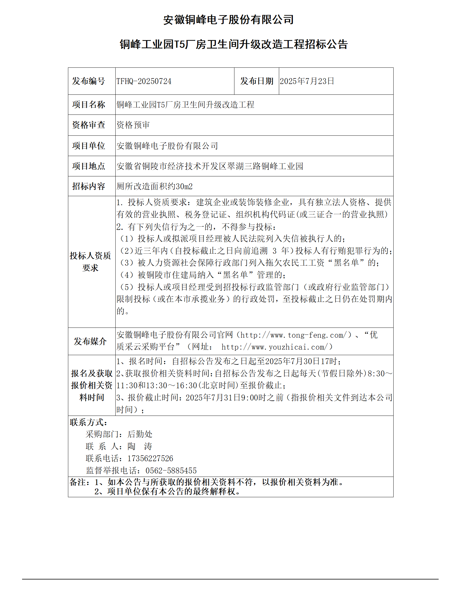 安徽銅峰電子股份有限公司 (銅峰工業(yè)園T5廠房衛(wèi)生間升級改造工程招標公告)_01